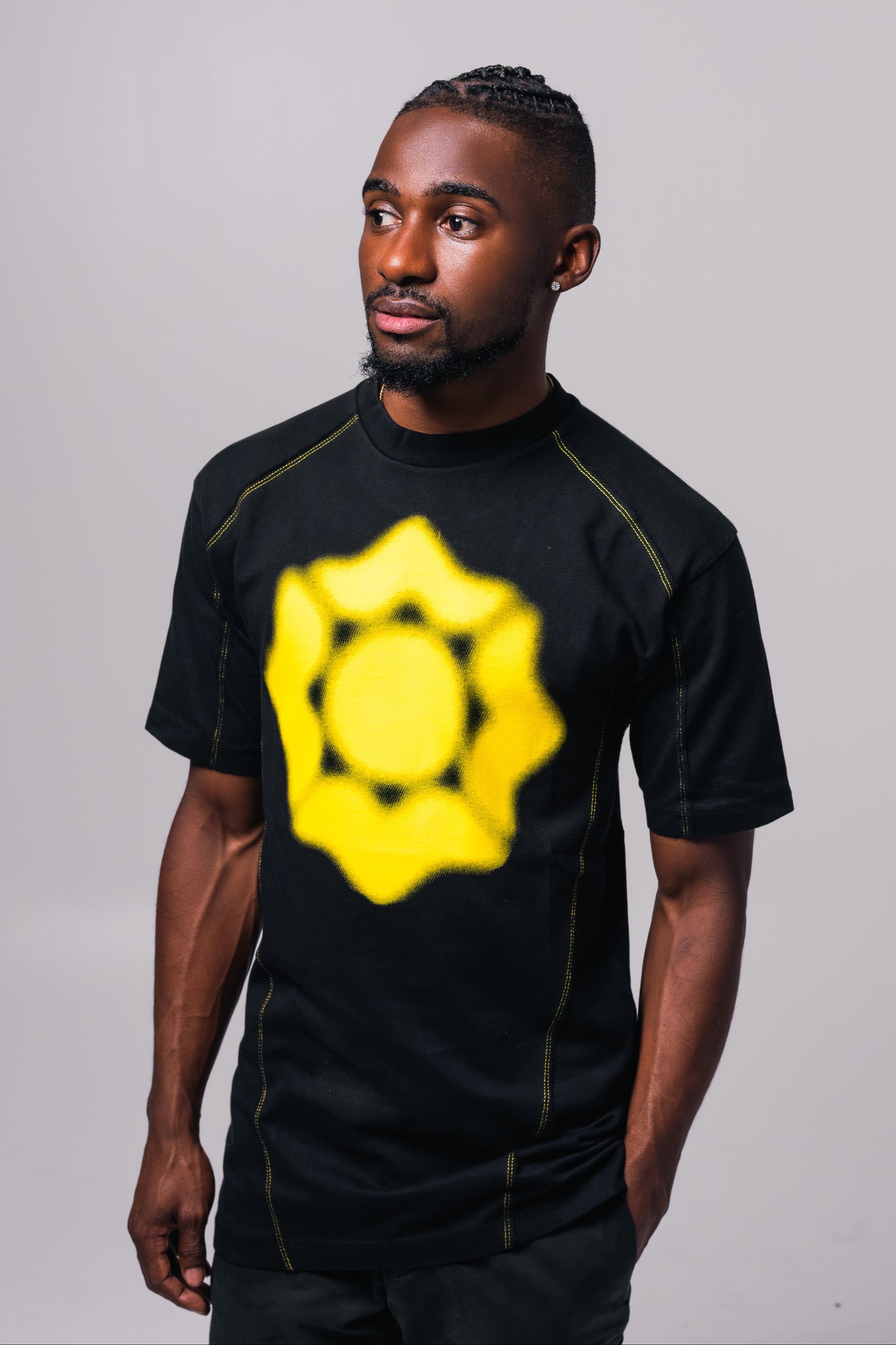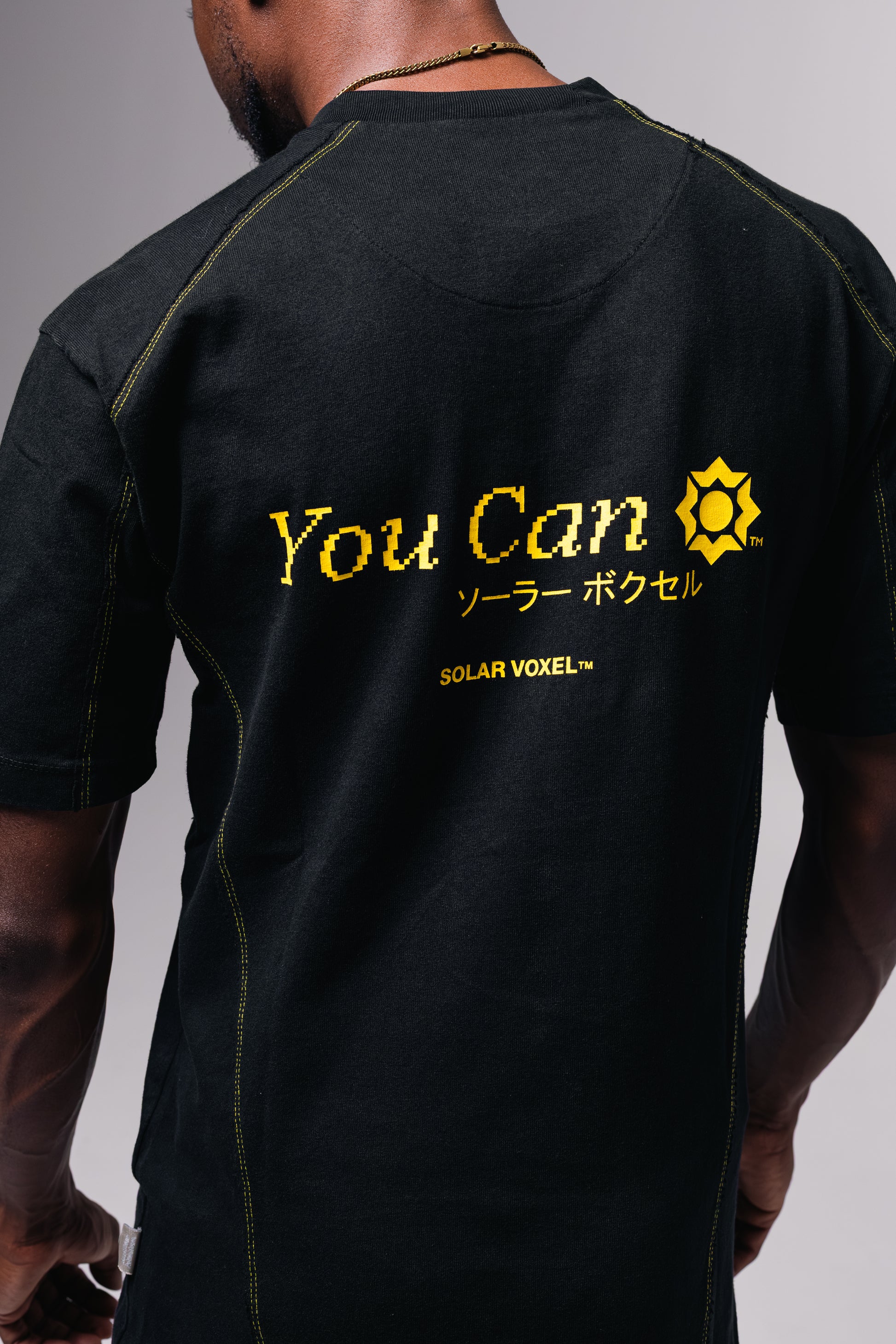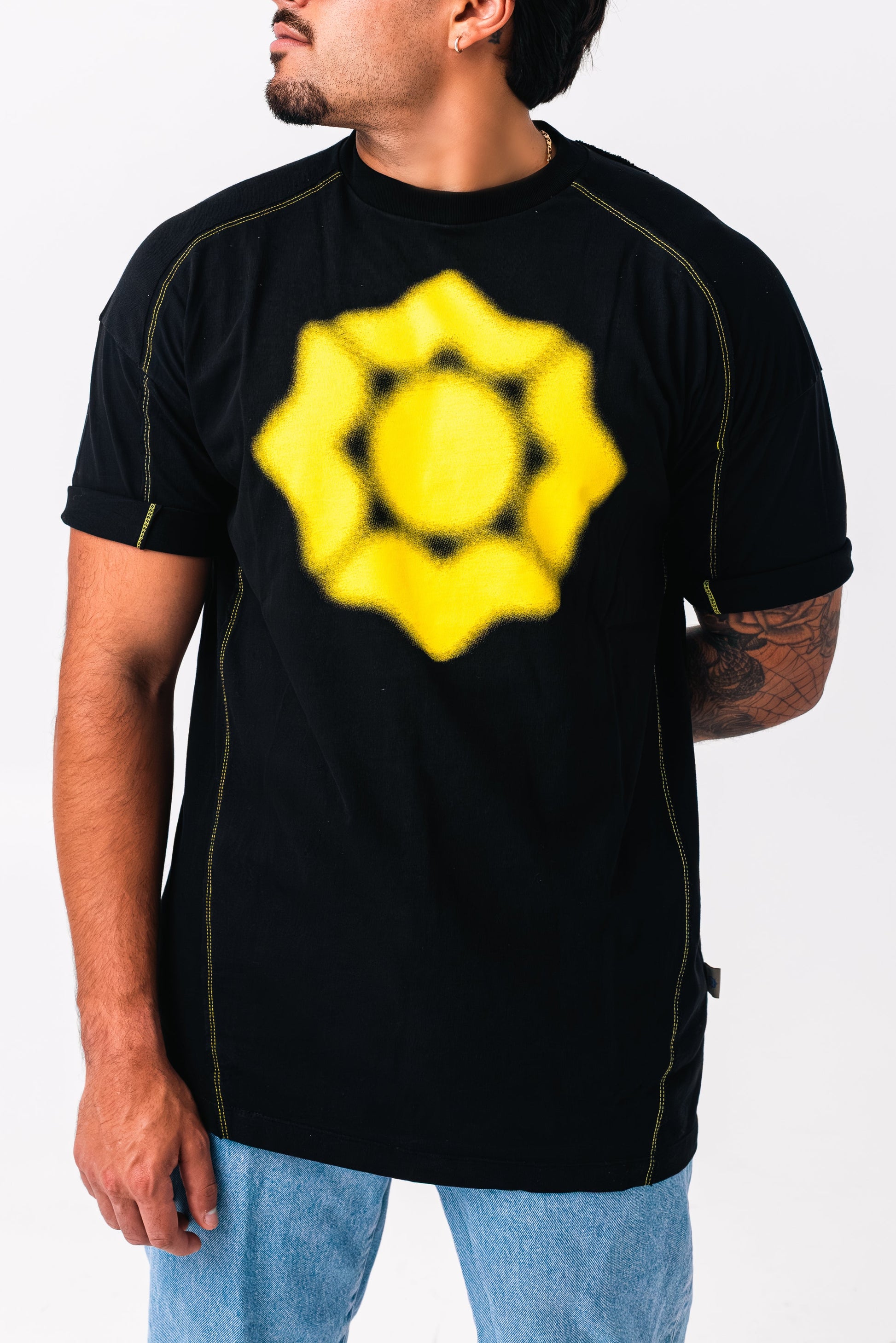 Boxy silhouette with cuffed ends and high-sitting neckline. Shirt fabric is dense enough for cuffed sleeves. Piece includes side panel, yellow "starburst" stitching, and front-facing, jet-sprayed, Voxel™ signature star.