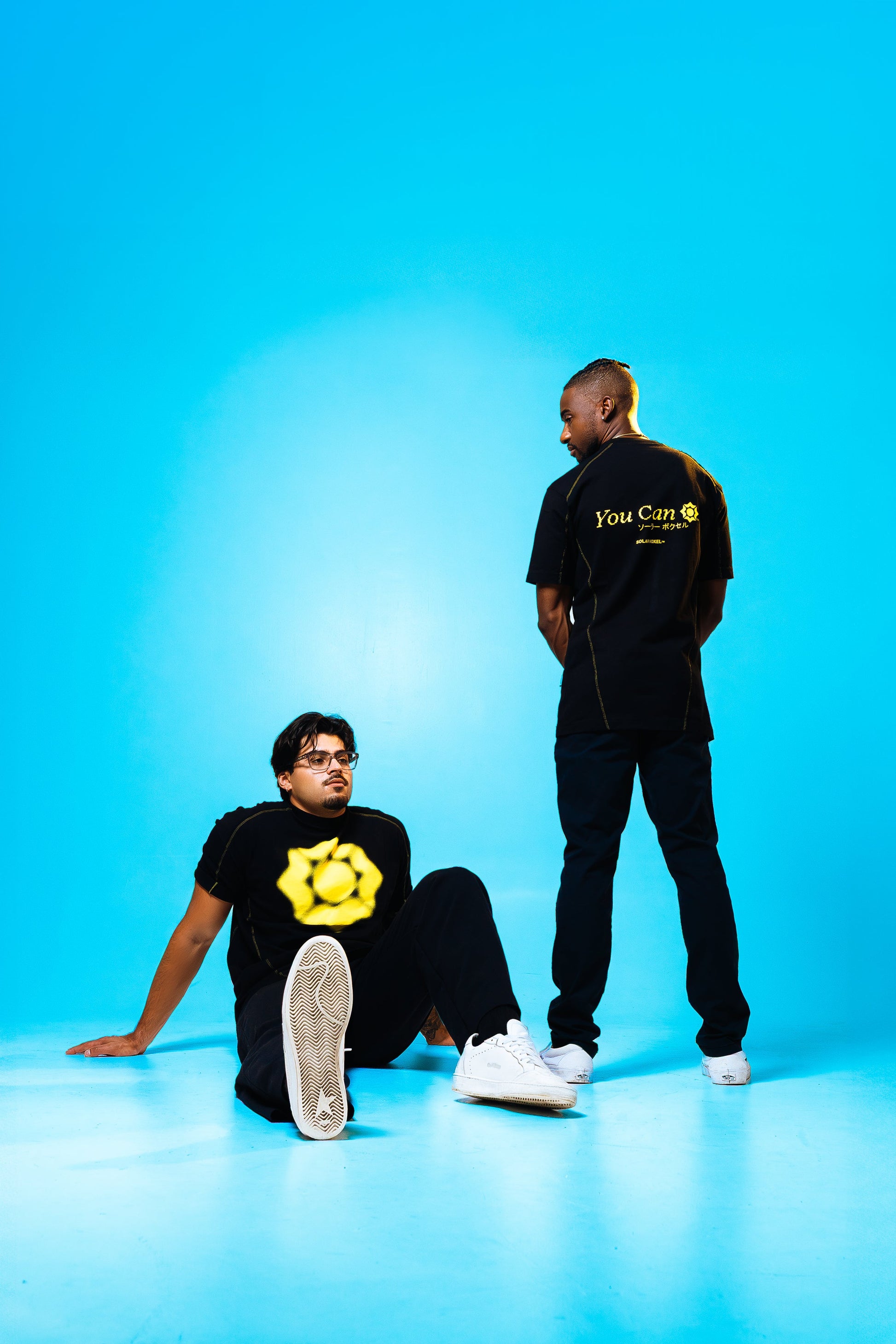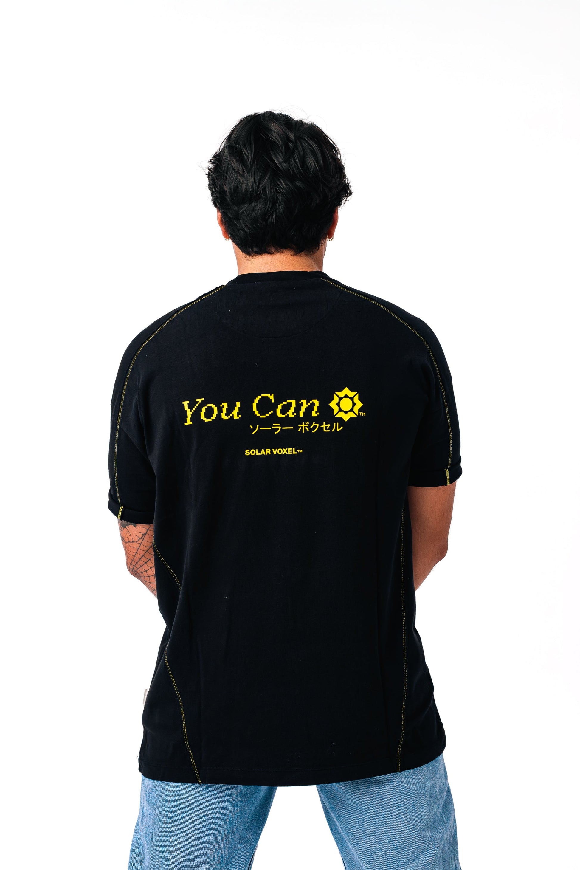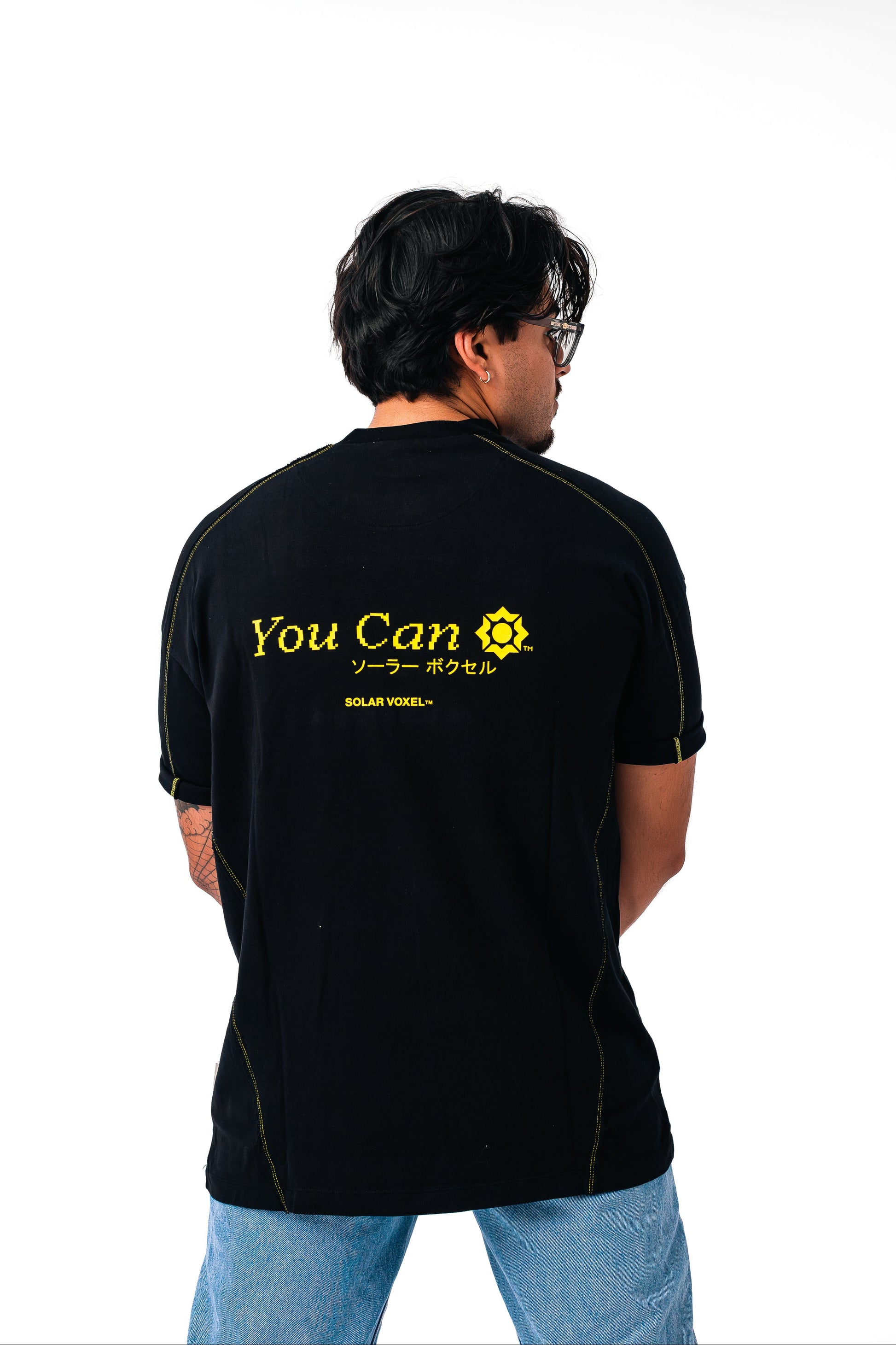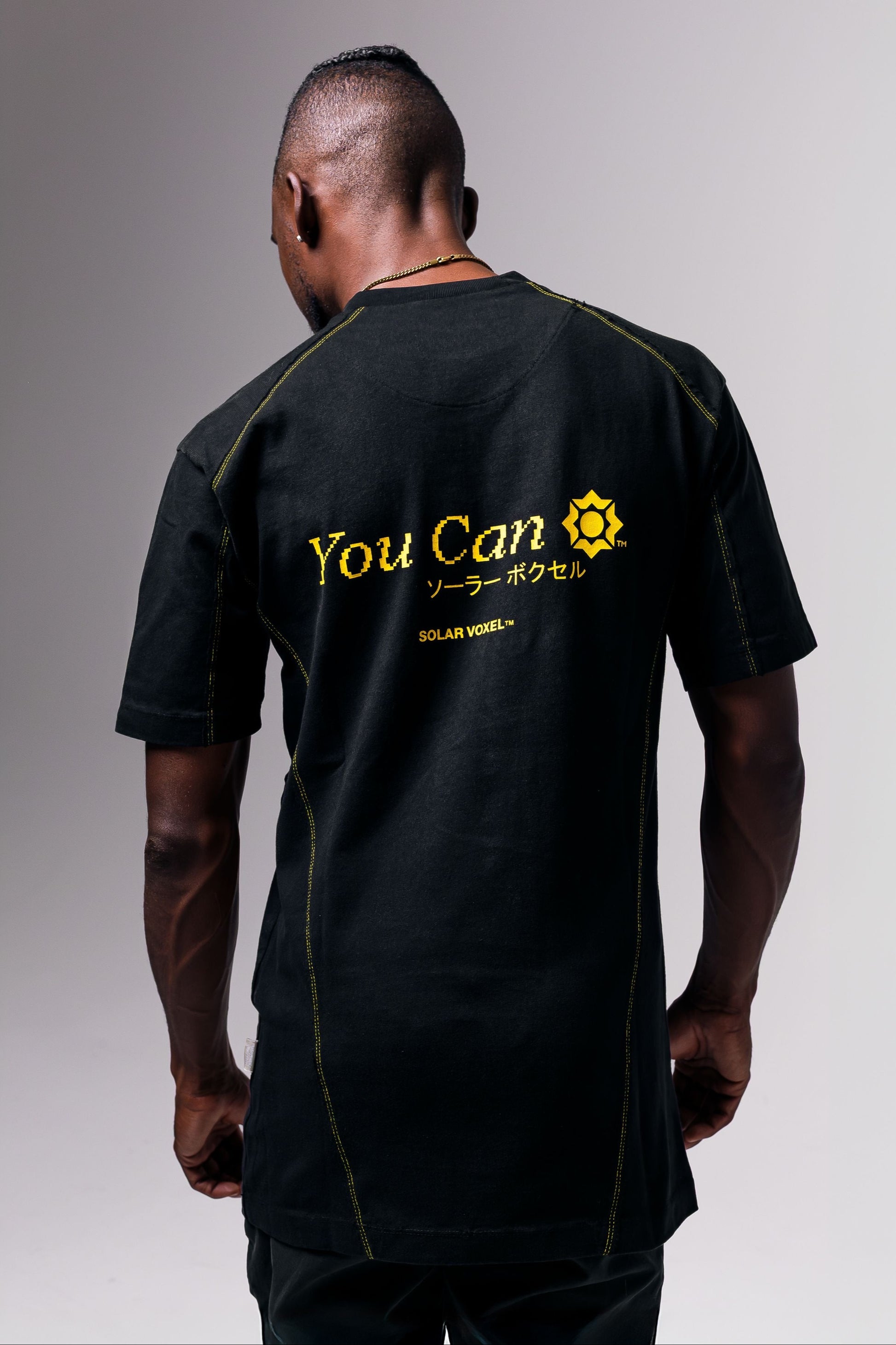 Boxy silhouette with cuffed ends and high-sitting neckline. Shirt fabric is dense enough for cuffed sleeves. Piece includes side panel, yellow "starburst" stitching, and front-facing, jet-sprayed, Voxel™ signature star.