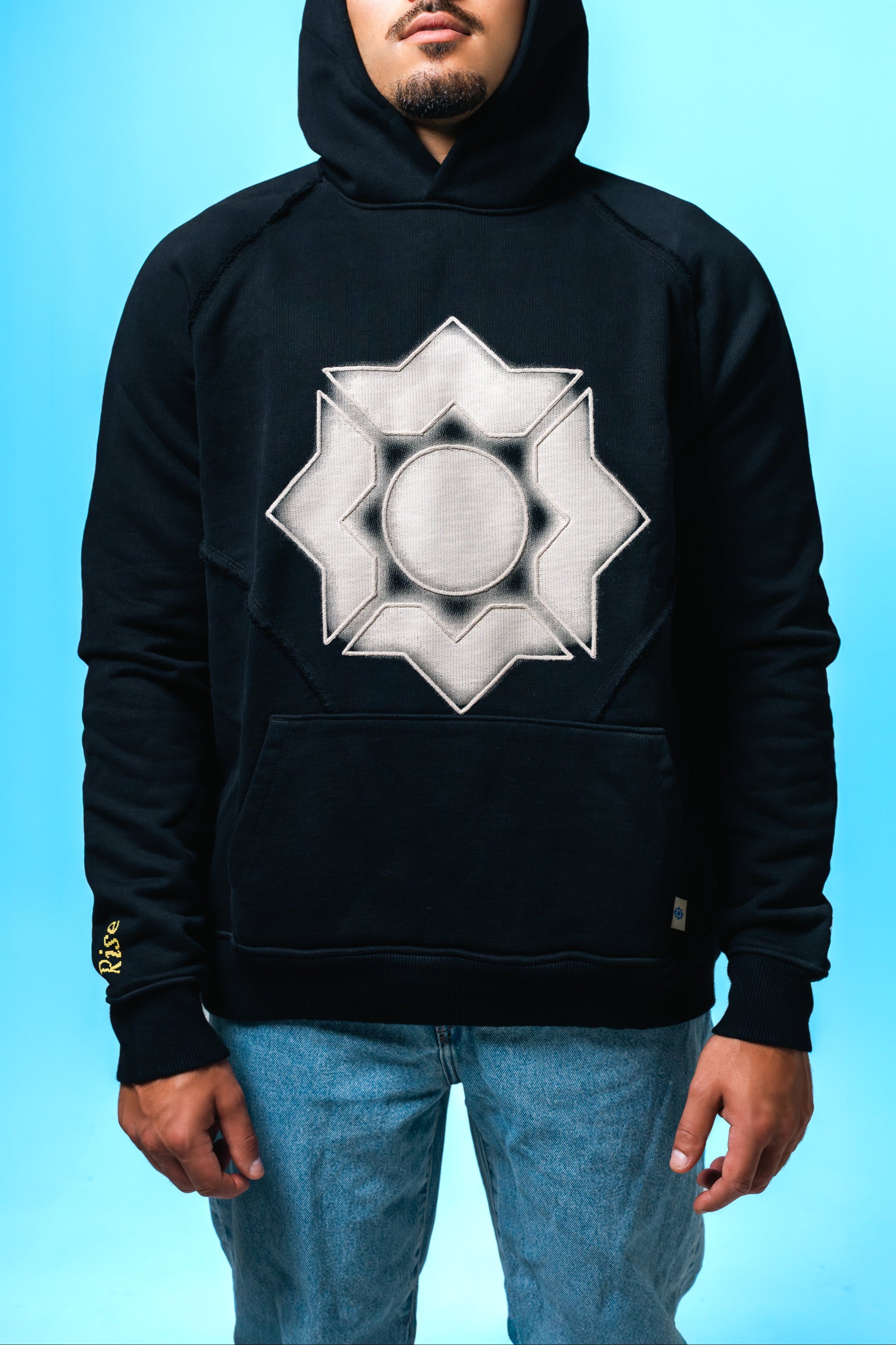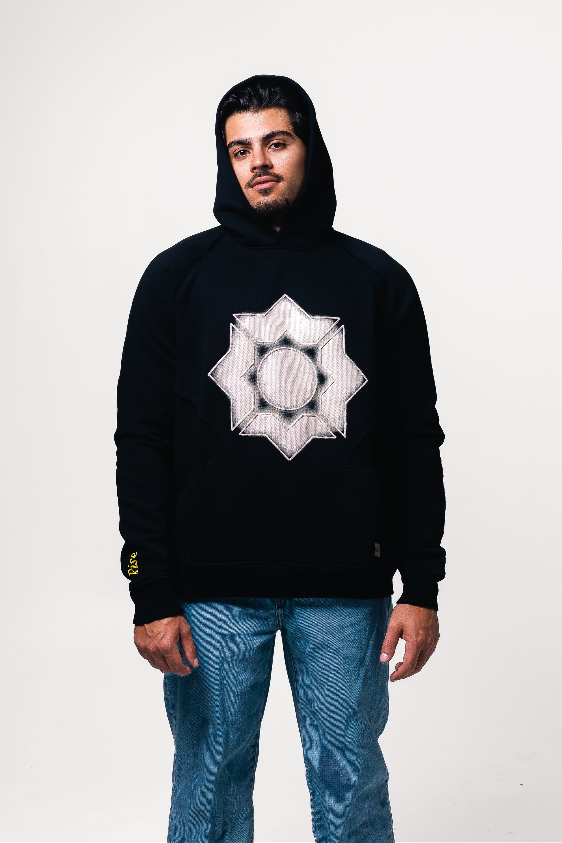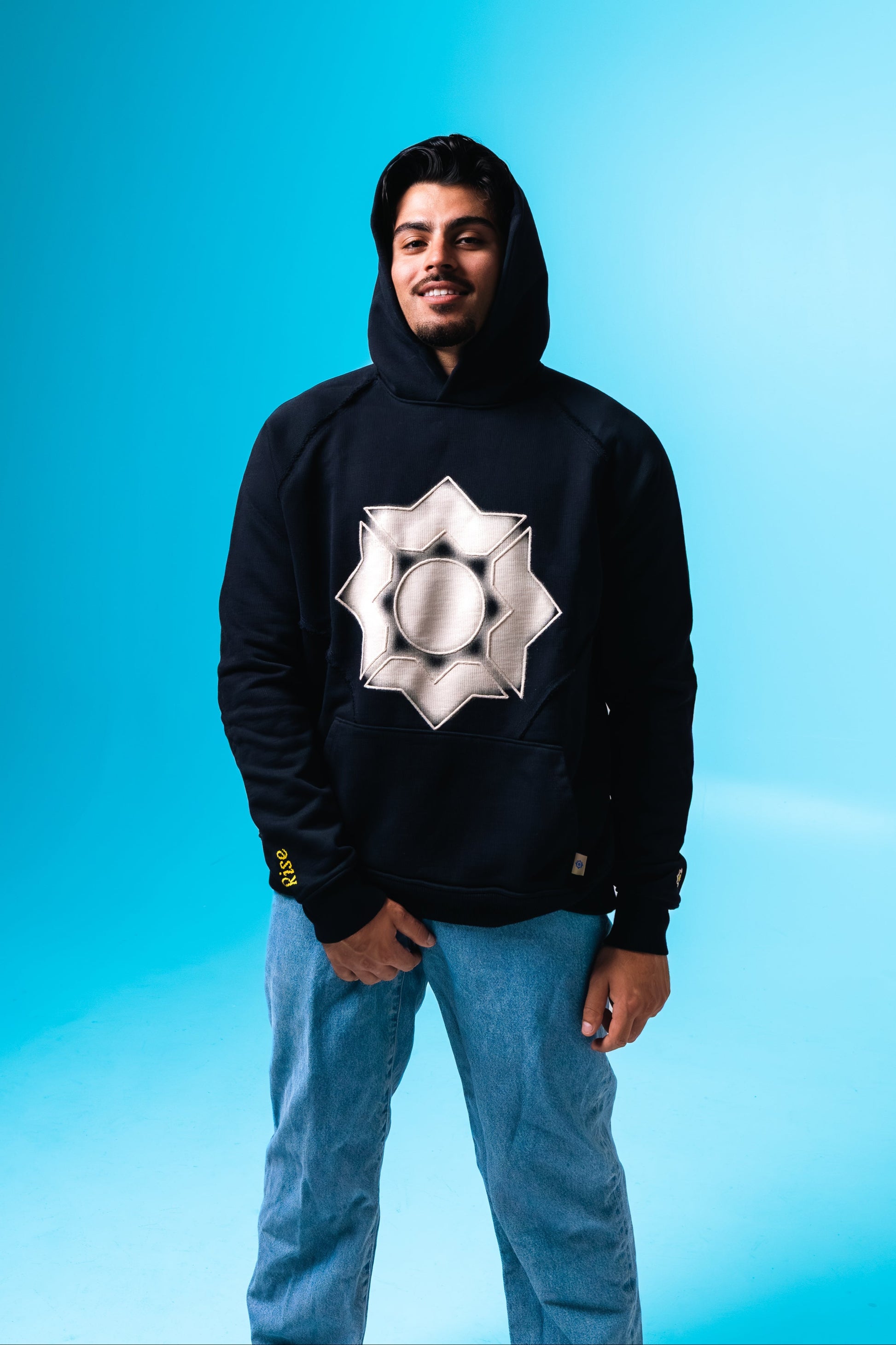 Sleeves and other sections of hoodie are slightly jet-sprayed to create distressed look. This design features starburst panel cuts and outward stitching with front-facing, jet-sprayed, Voxel™ signature star and embroidered outline.